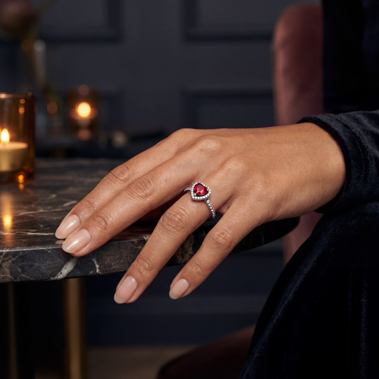 SET CONJUNTO COLLAR + ANILLO + ARETE CORAZÓN ELEVADO ROJO PANDORA