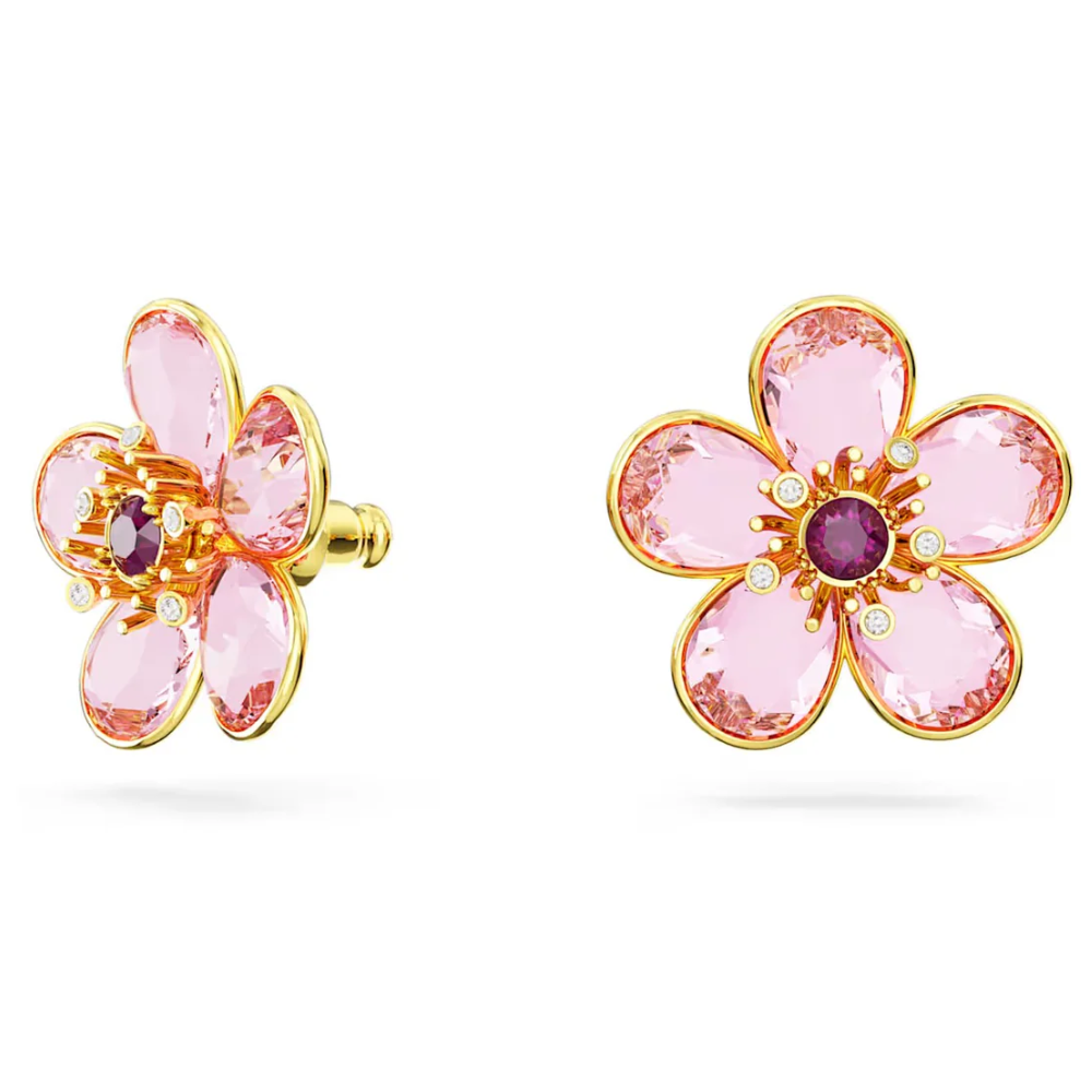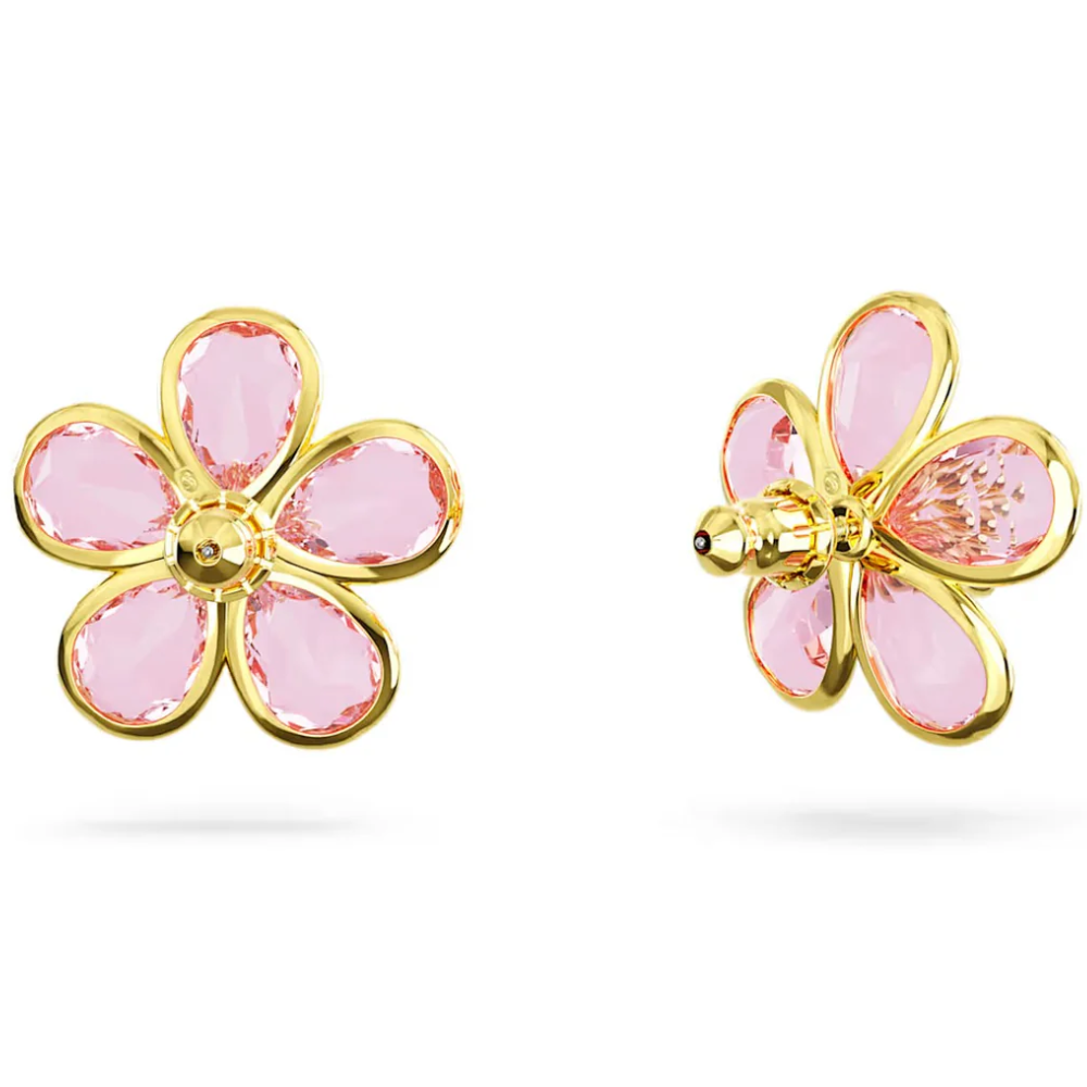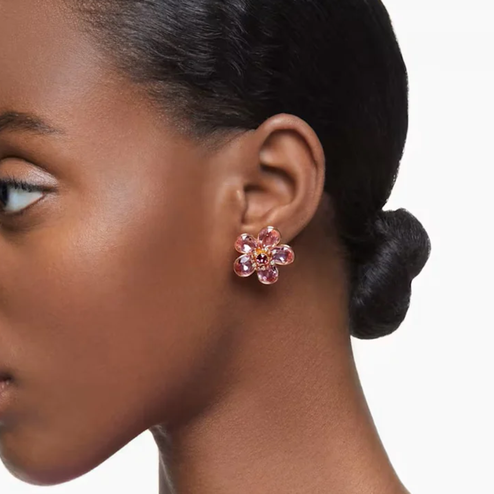 Inspired by the wondrous beauty of nature, these magnificent earrings are brimming with fine crystals. Finished in 18k gold, their pink design features five petals artfully arranged around a deeper-hued center stone. A captivating design.