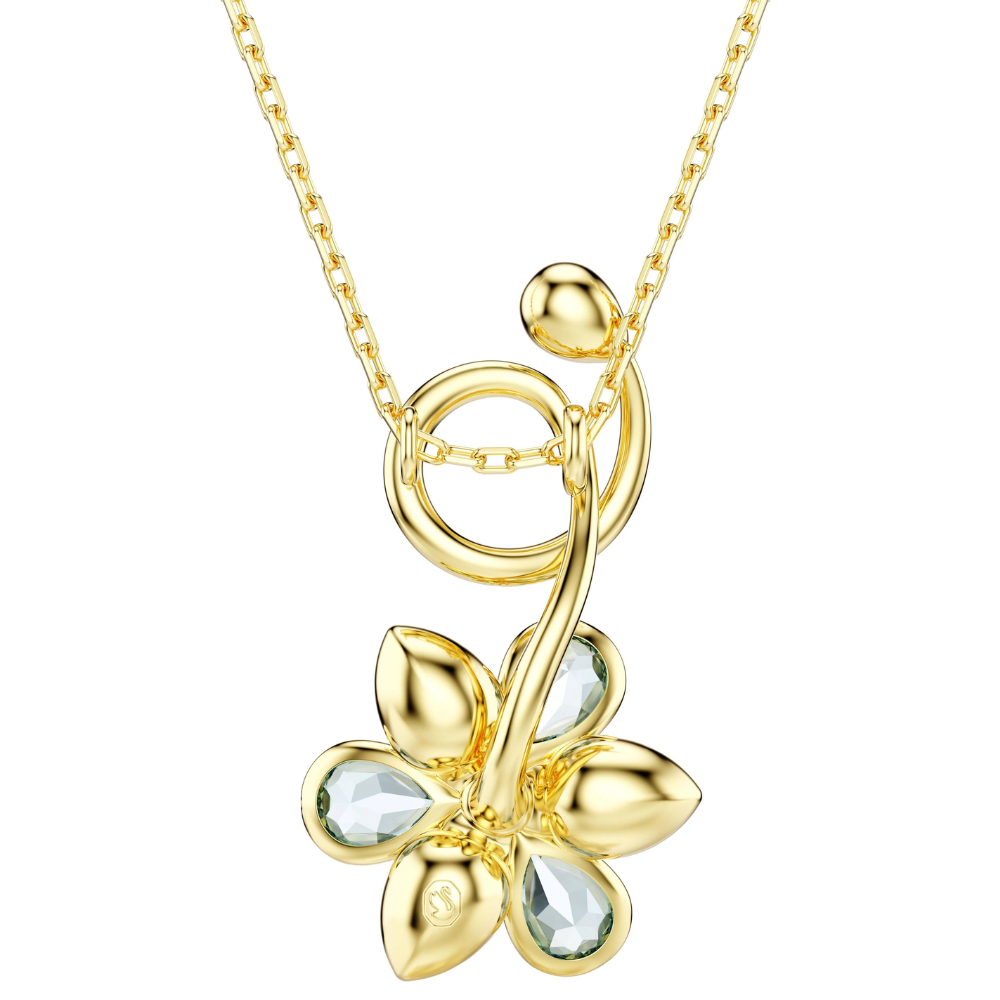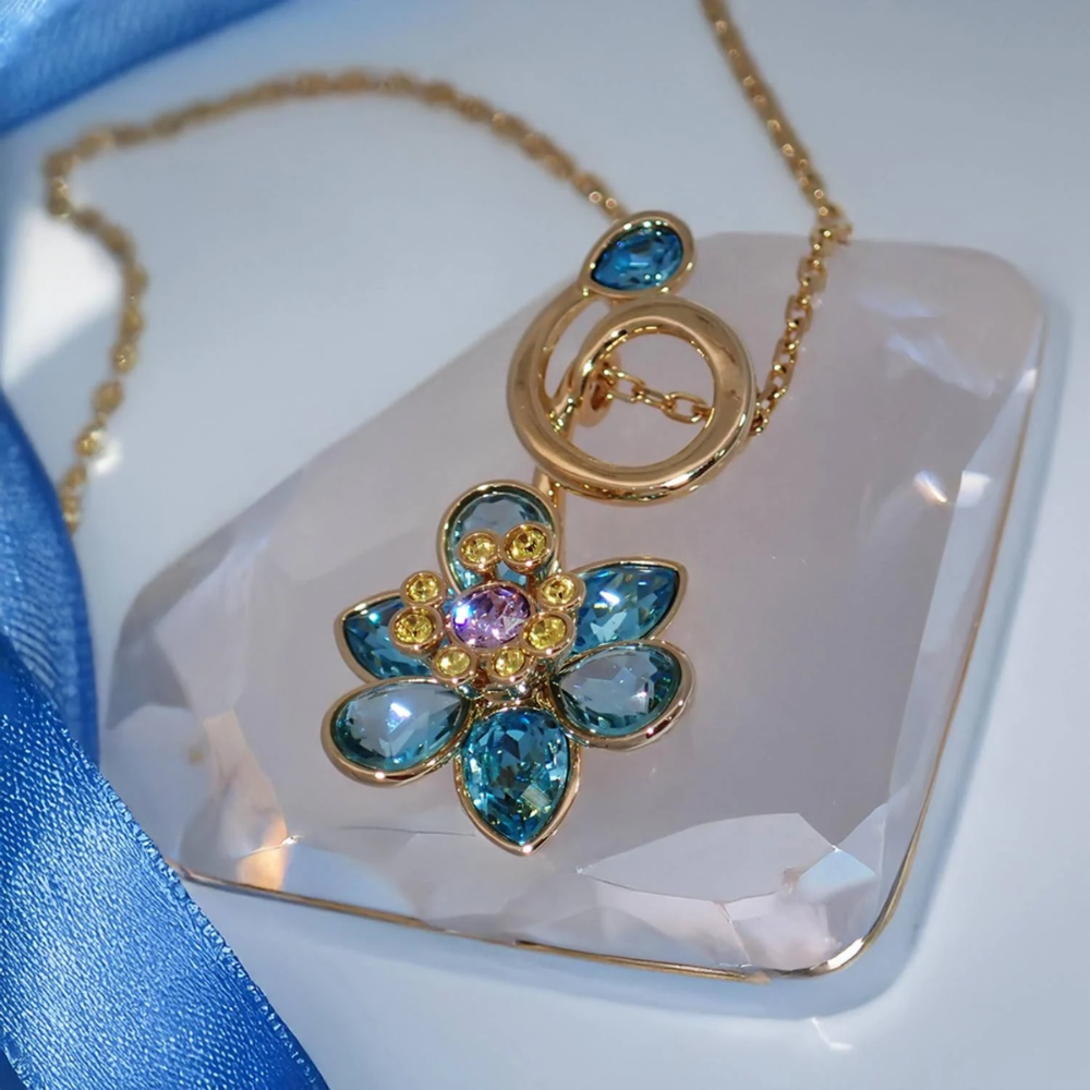 Illuminate your style with this crystallized tribute to nature. Suspended from a delicate chain, the central motif is shaped like a flower, with radiant blue petals and a gold-plated stem. The mix of shapes and hues gives this Idyllia pendant an infusion of joy that will brighten your day.