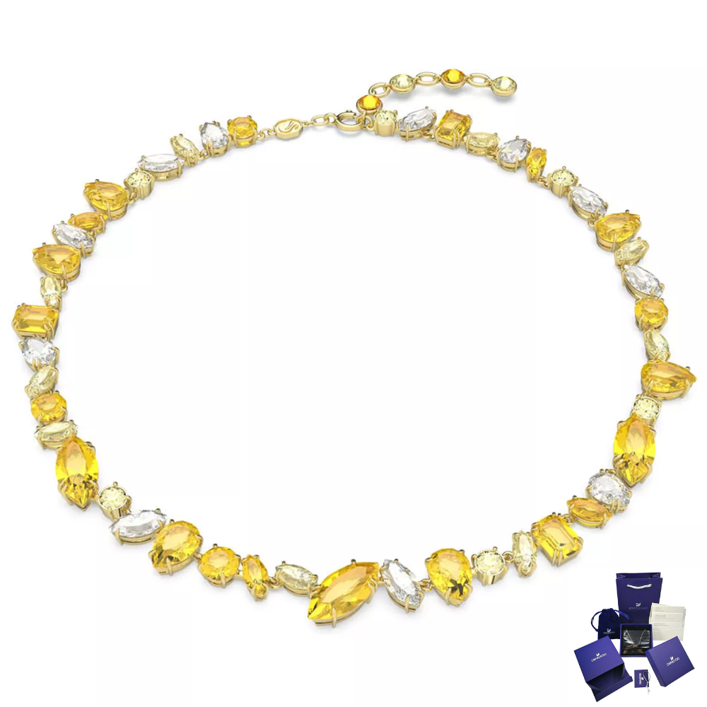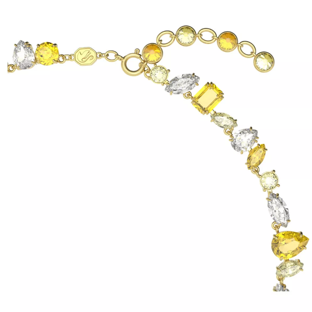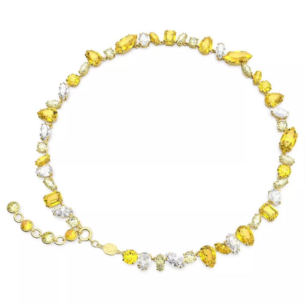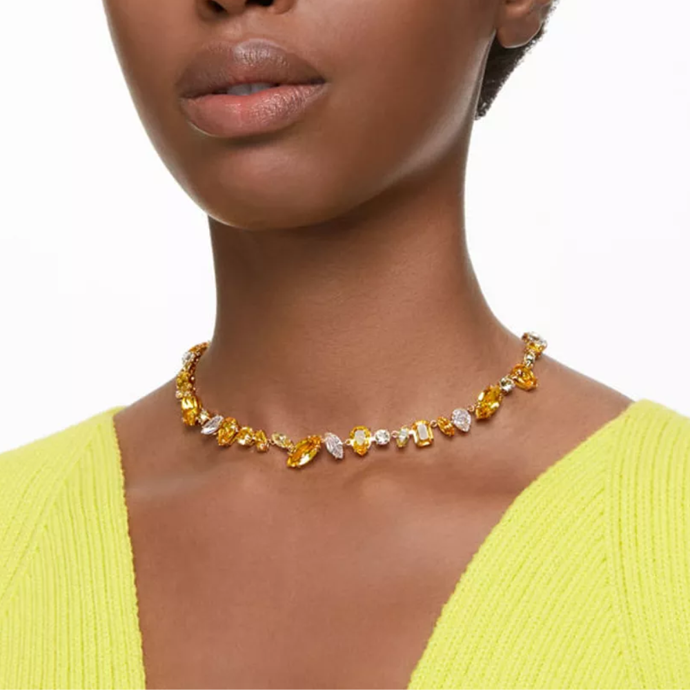 A testament to the vibrant essence of the Gema family, this vibrant necklace combines crystals in a variety of extraordinary cuts that work as one. The gold-tone plated design features clear and yellow crystals in a unique pattern for an authentic and personal look. Wear this necklace to instantly brighten your look.