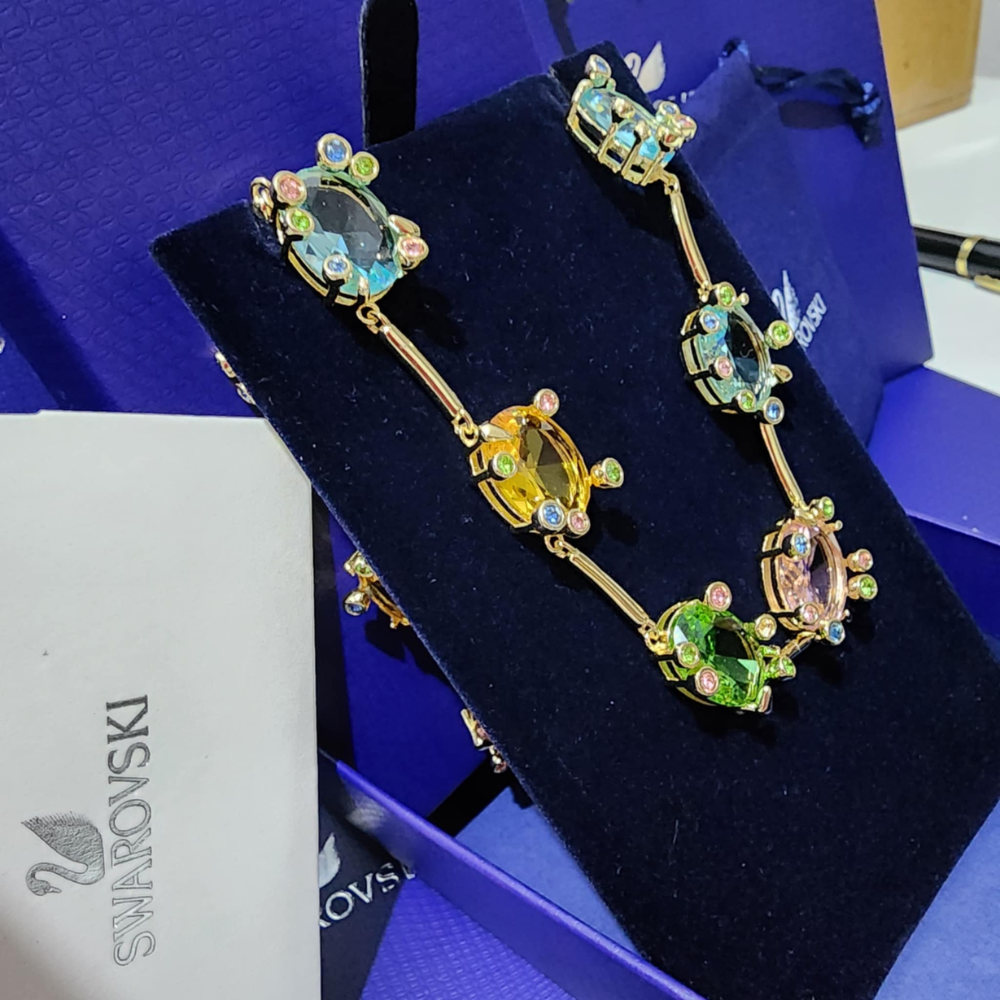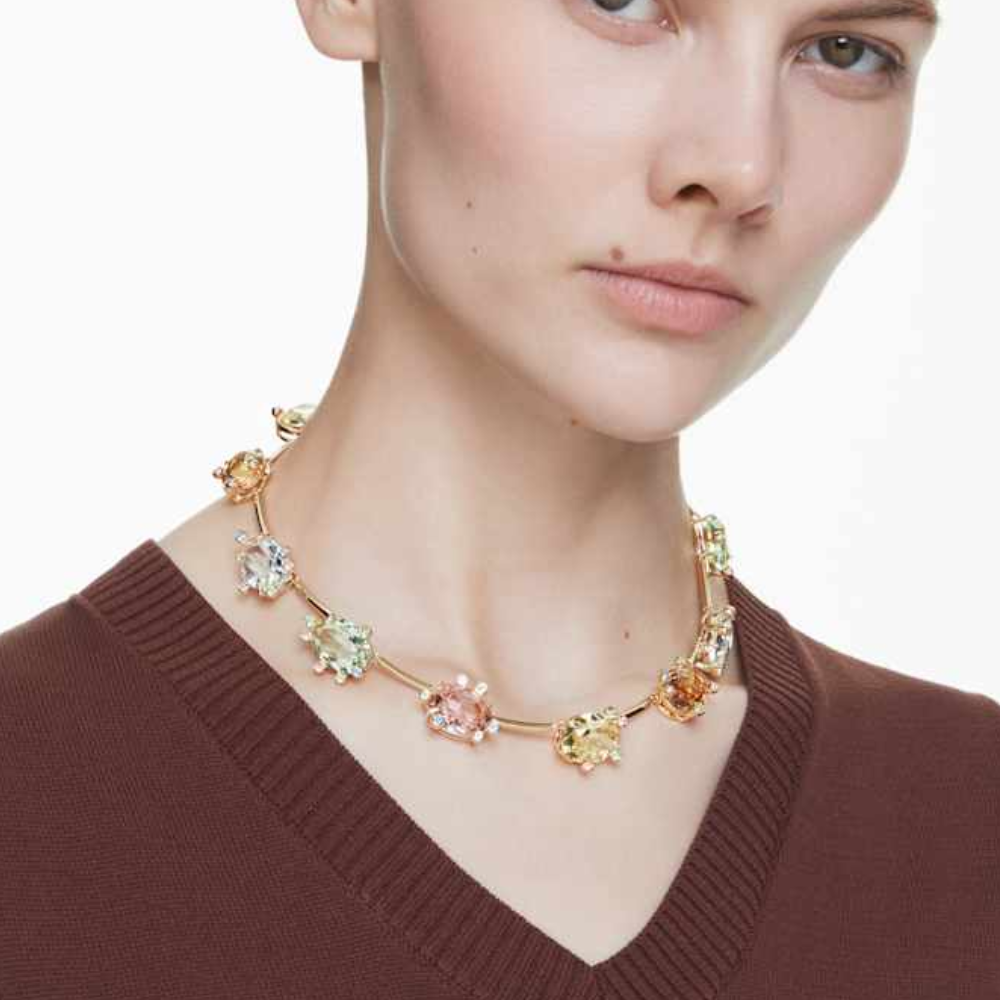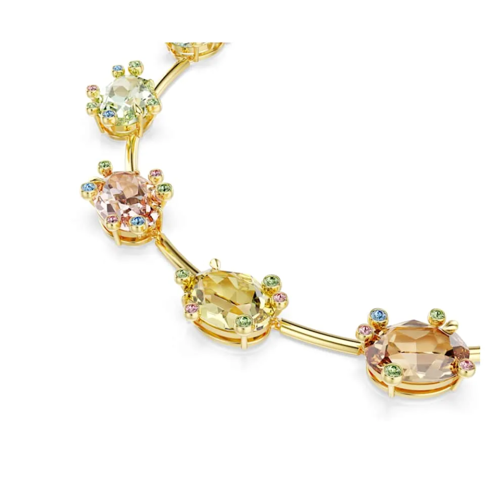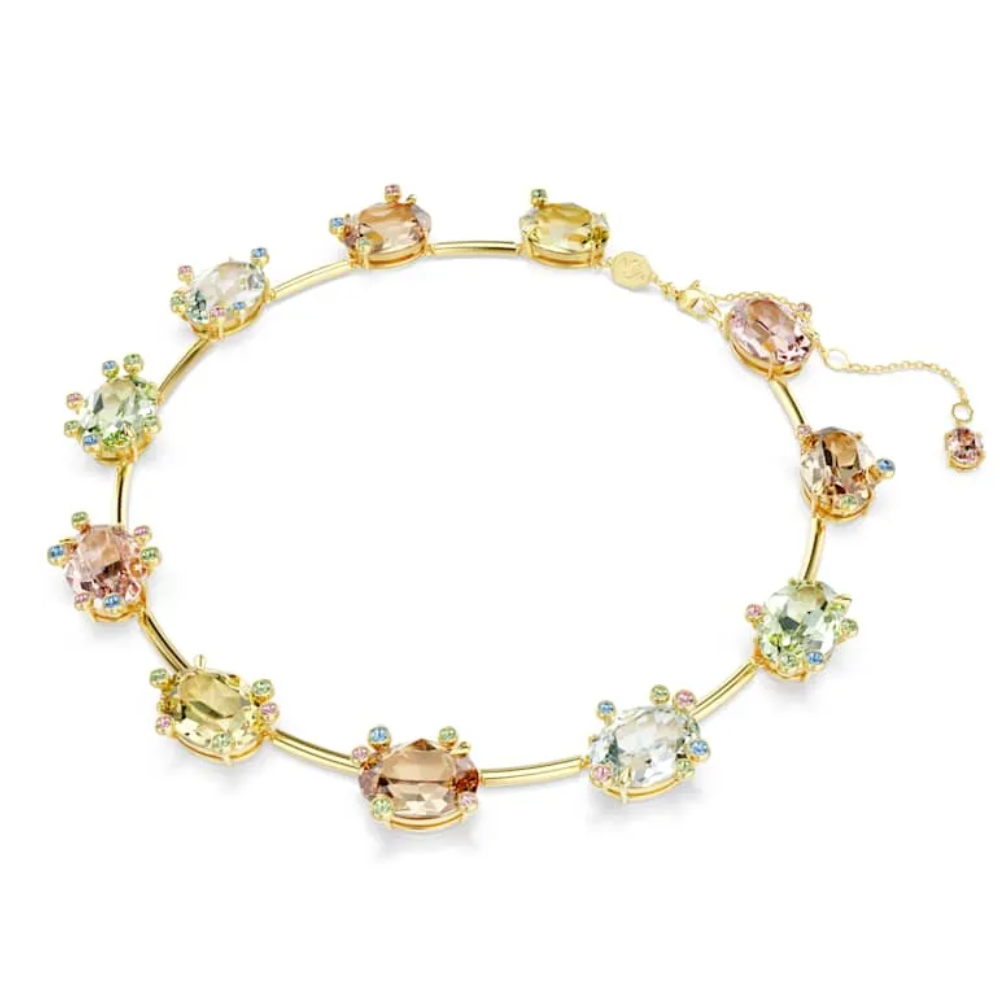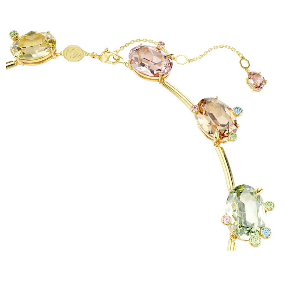 Imagination and fantasy come together in this kaleidoscope of colors from Swarovski. This gold-tone plated necklace showcases a succession of oversized crystals in a joyful explosion of vibrant hues, each surrounded by smaller, prong-set crystals. The result is a vibrant accessory that will lift your spirits every day. Pair this necklace with the matching bracelet to enhance the joy.